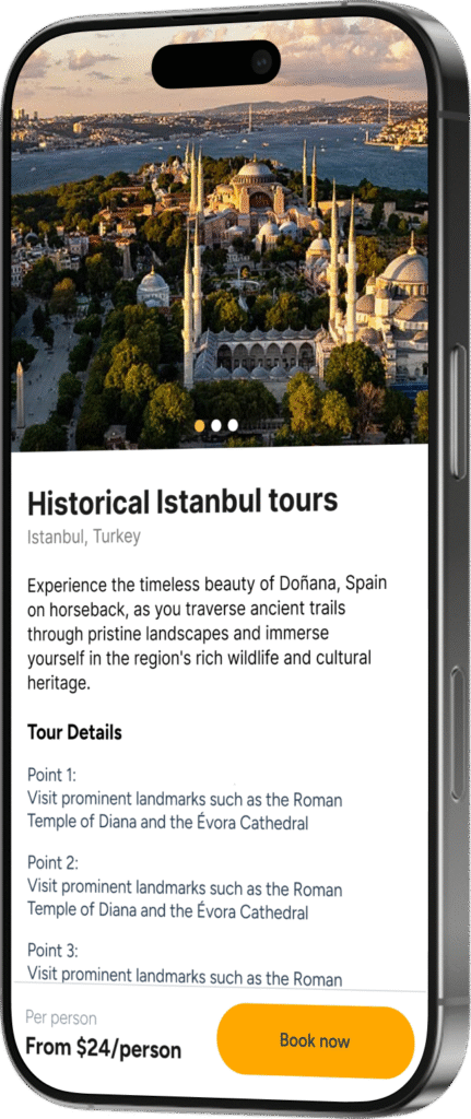 A mobile app connecting tourists with local tour guides across Turkey. Find and book nearby activities by interest (nature, history, etc.) all in one place.